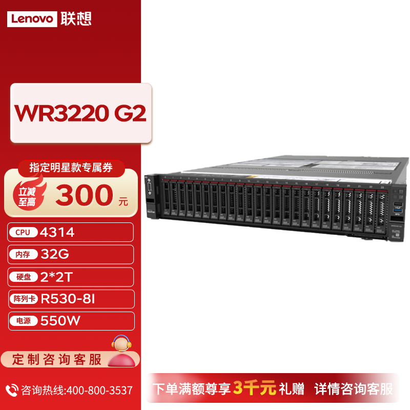 联想(Lenovo)【WR3220G2机架式服务器】数据库2U存储服务器国产电脑主机 4310/32G/2*2T/R530-8I/550W